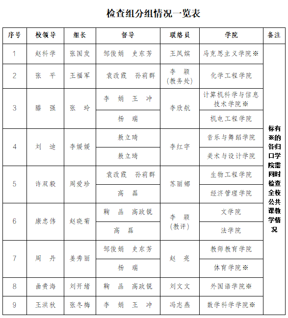 为进一步夯实教学过程管理,持续改进教学中存在的问题与短板,切实提高教育教学质量和教学效果。在第八至十教学周(10月27日至11月16日),由校领导带队,组成9个专项检查组,对各教学单位开展教学检查工作,各组组长负责协调推进本组工作。具体安排如下:
