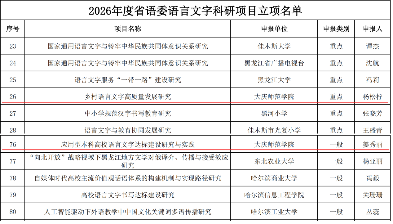 近日,黑龙江省教育厅、省语言文字工作委员会发布2026年度省语委语言文字科研项目立项名单,我校有2个项目成功获批立项。其中,教师教育学院教师杨松柠申报的《乡村语言文字高质量发展研究》获批重点项目,教师教育学院教师姜秀丽申报的《应用型本科高校语言文字达标建设研究与实践》获批一般项目。