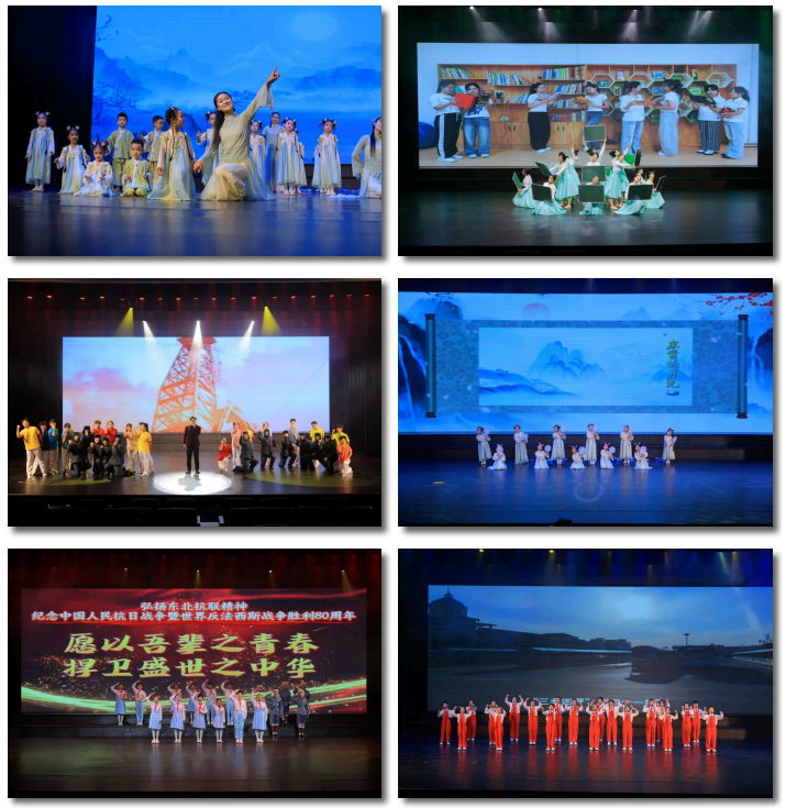 启动仪式上,来自我校和大庆市中小学幼儿园的师生展示了精彩的语言文化艺术节目,用歌声、诵读声抒发了爱国情怀。大庆市幼教中心情景剧《童声诵经典 诗韵润童心》,让观众跟随孩子们纯净的童声,穿越时空长廊,触摸中华文化的基因密码。大庆师范学院女子群舞《薪火•花开处》,是一曲对教育初心、理想承继的深情颂歌,展示了关于责任、热爱与永恒传承的动人礼赞。大庆师范学院经典诵读《春江花月夜》,以普通话连接古今,以笔墨为舟、以声韵为桨,将书法作品与古典乐器同时呈现,体现了文化传承的创新表达。启动仪式在大庆市庆风小学课本剧《多彩童心 团结一家》的精彩表演中落下帷幕。