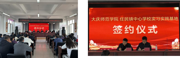张国发处长与任民镇中心校王文宪校长代表两校签订了实习实践基地协议,并共同为实习实践基地揭牌。